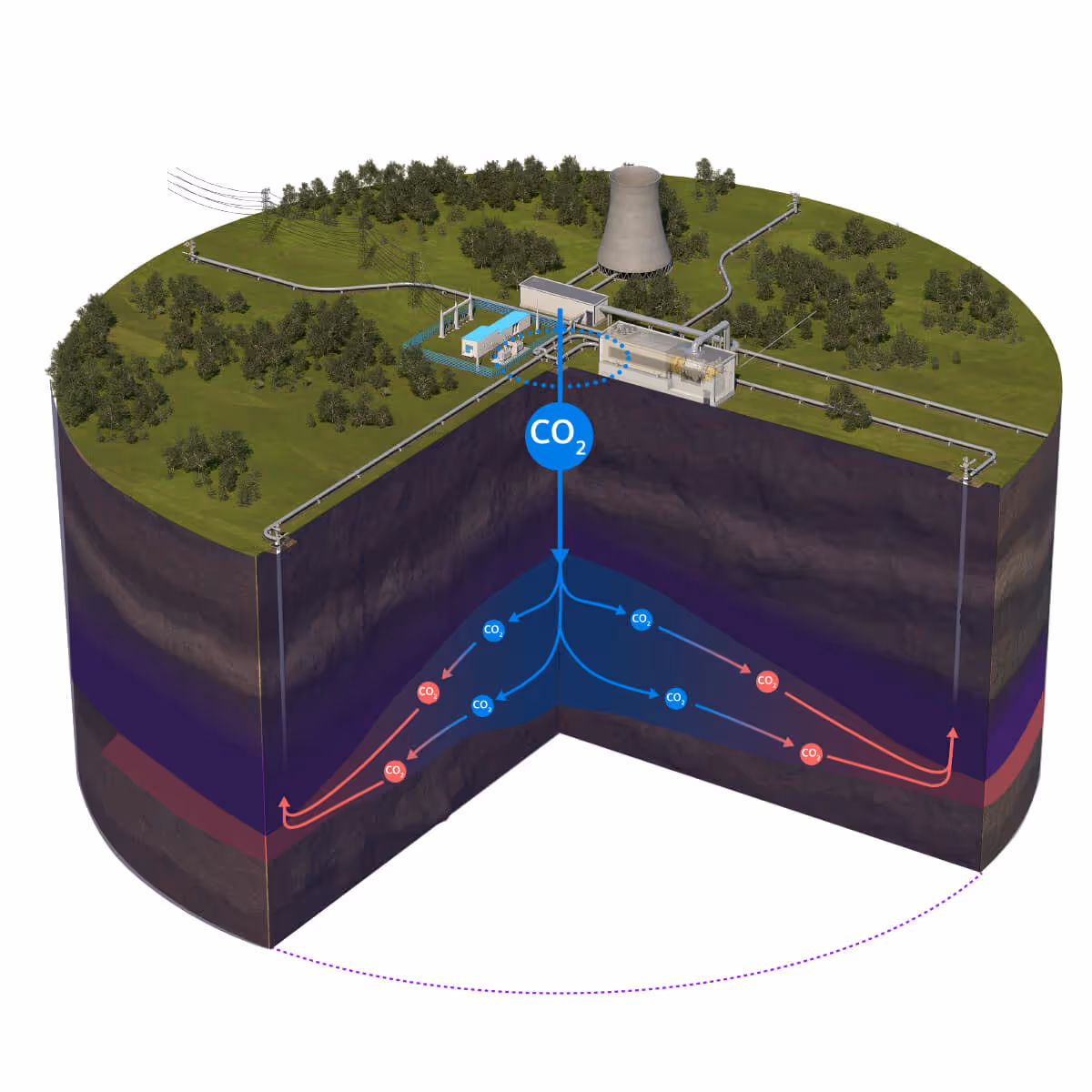 CO2 is injected into deep, porous geological formations, where it is safely stored.
